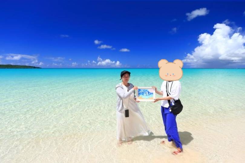 今回は私がお願いしたビジョンペイントのヒアリングも兼ねて、画家の友人が宮古島に来てくれることになったけど、綺麗な海をバックに、私が宮古島に旅行するきっかけにもなった、前回2023年4月に描いてもらった絵を持って記念撮影もしてもらった。
