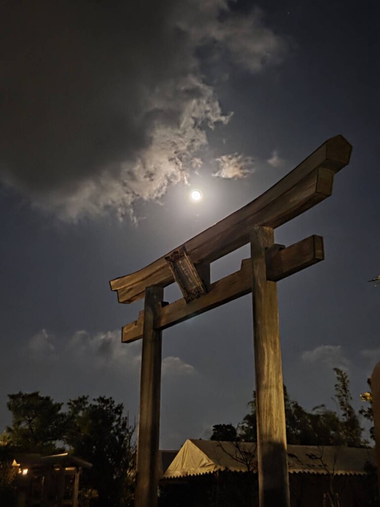 前日昼間に満月を迎えたお月様が雲から顔を出して、鳥居を明るく照らしていた。