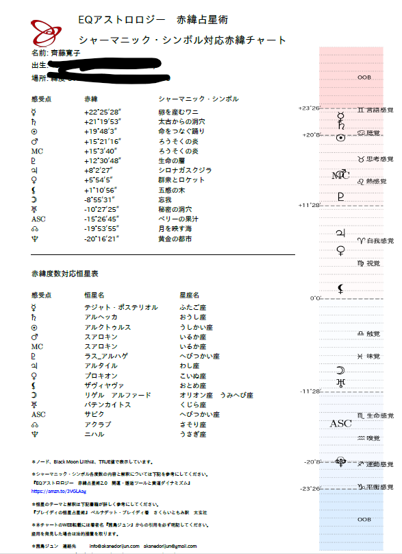 茜鳥ジュン先生のシャーマニック・シンボル対応赤緯チャートのサイトで、自分の生年月日と出生場所の緯度と経度を入れると、表示されるチャートがこちら↓