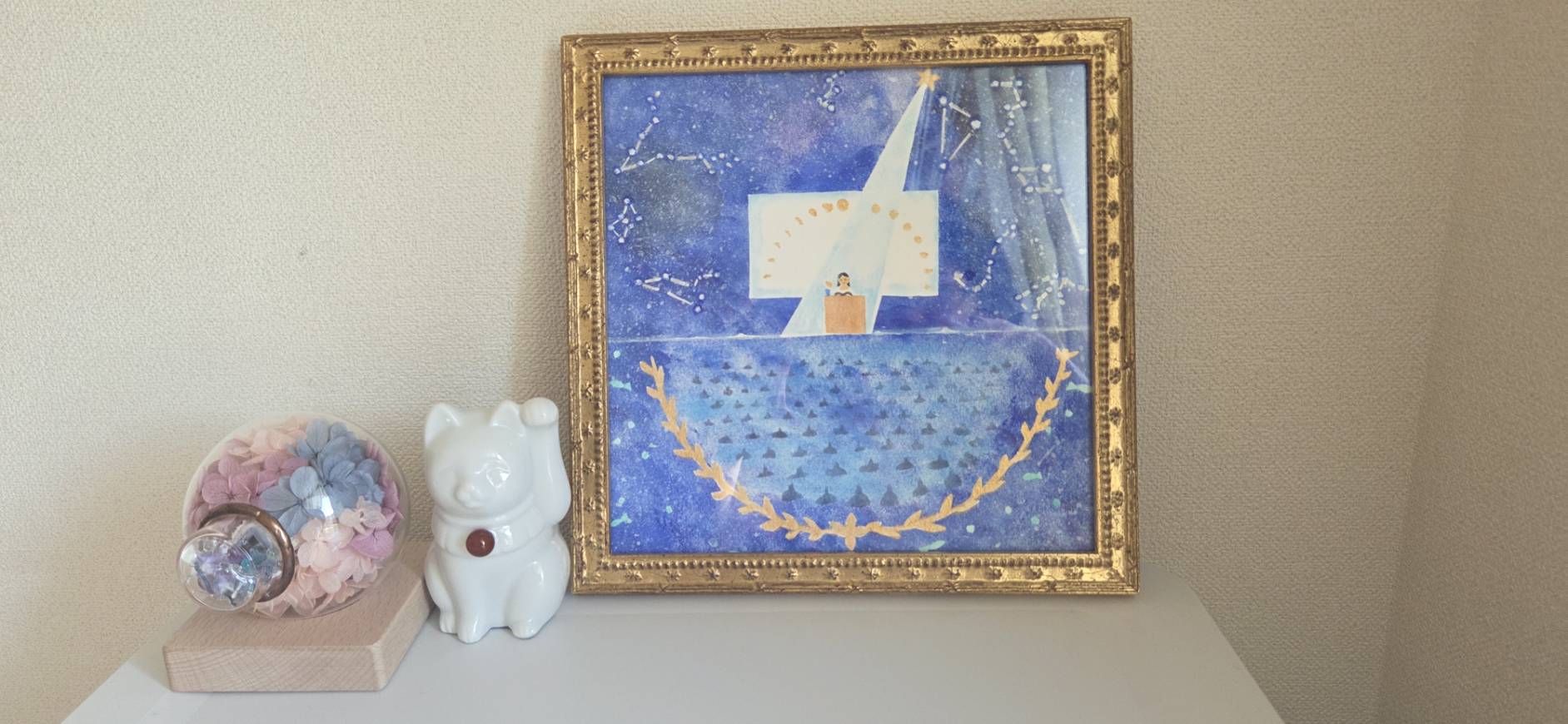 昼間にはようやく、先月お願いしていたビジョンペイントが紙とデータで届いたので、招き猫と万華鏡の横に。