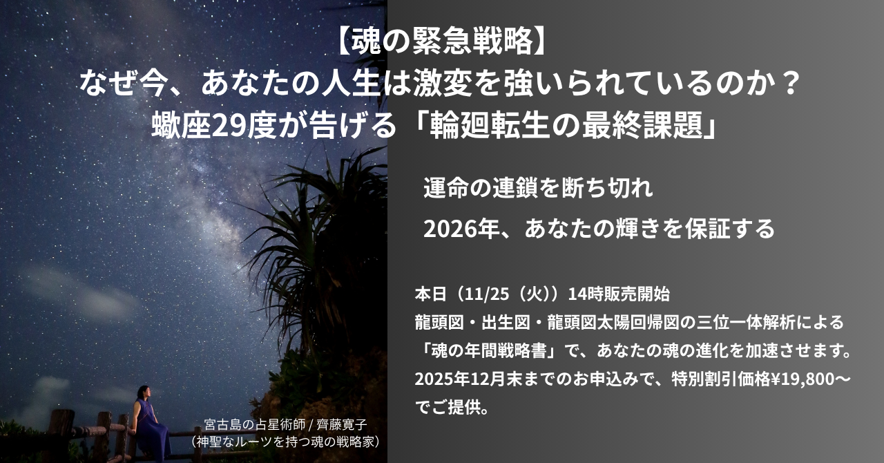 | エグゼクティブ・エディション(最高峰の変容保証) | ¥44,000~ | ¥29,700~ | 特装版レポート + 齊藤寛子による45分個人セッション。最も深刻な課題を抱え、魂が設定した最高のチャンスの時期で究極の成功を掴みたい方へ。