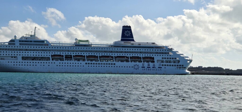 そして、もうすぐ港に着く頃に目の前に見えた豪華客船の名前が「Astro Ocean」(アストロオーシャン)だった!!