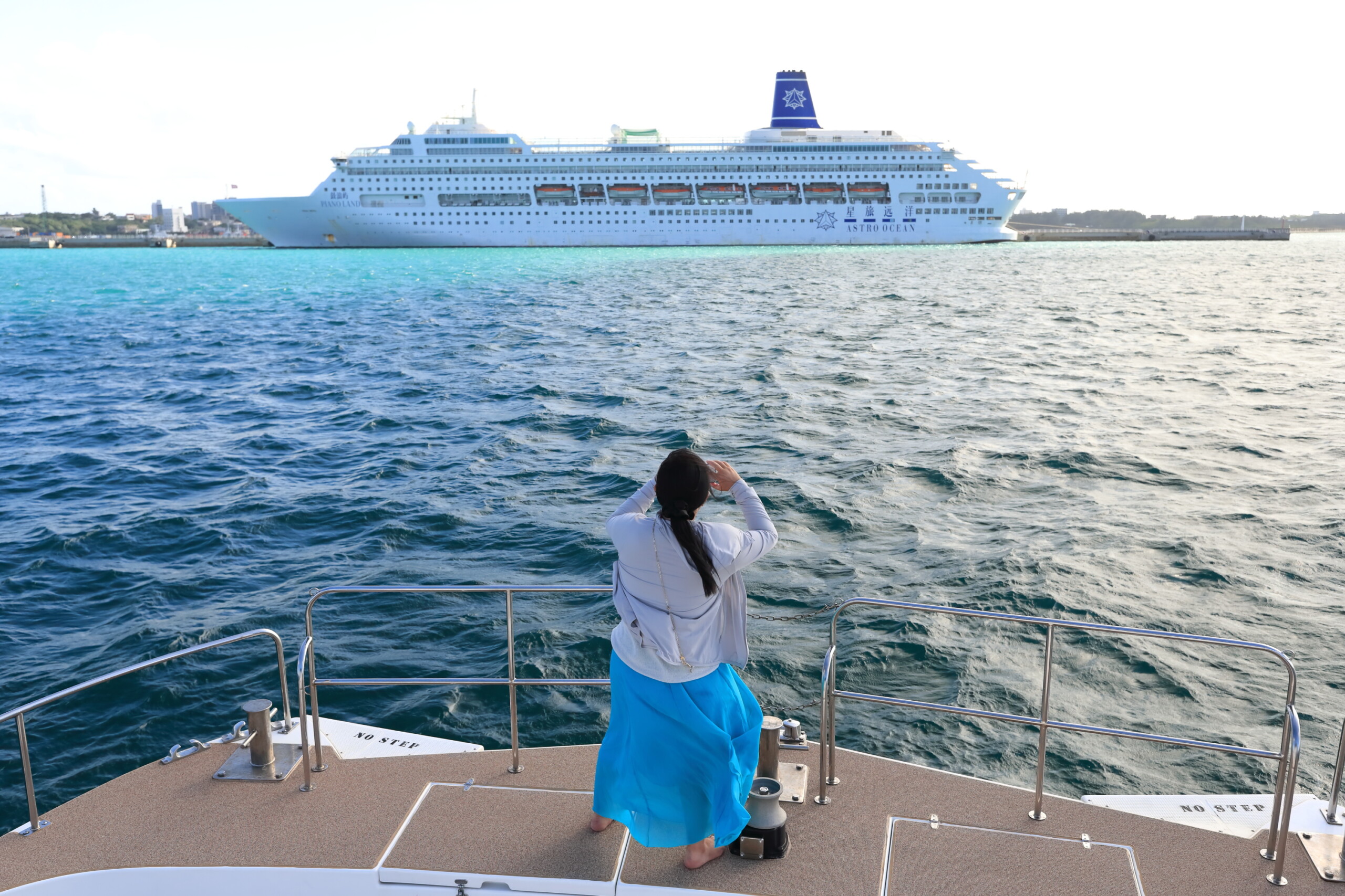 激しく揺れる船でその原点を思い出し、「今までもこれからも、どんな荒波に遭遇しようが、魂が目指す場所を決して忘れないようにしよう」と心に誓った、まさにその直後、港の目の前に、まるで目的地を象徴するかのように、巨大な豪華客船が停泊していたのです。