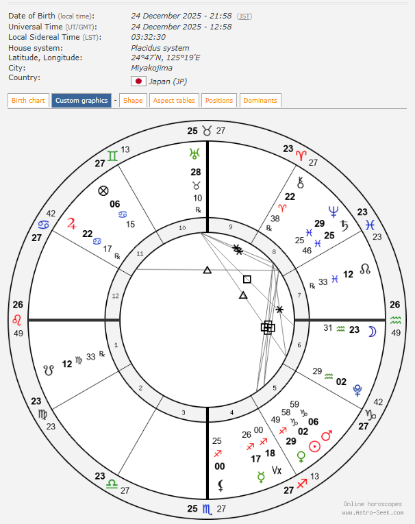2人のコンポジット(合成図)では火星と木星がタイトに合で、それが私の龍頭図の魚座ASCと重なるという配置。