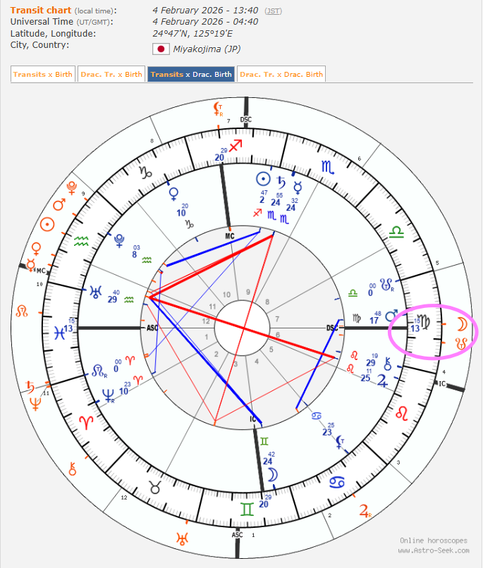 驚くべきことに、この時、T乙女座の月は、私の龍頭図(ドラコニックチャート)のDSCと重なっていました。 龍頭図のDSCは、魂が今世で出会うと決めてきた協力者との「約束」のポイントです。そこに「実務」と「精査」を司る乙女座の月が重なったことは、これから共に歩むパートナーシップに対し、魂レベルでの契約更新が行われたことを意味しています。