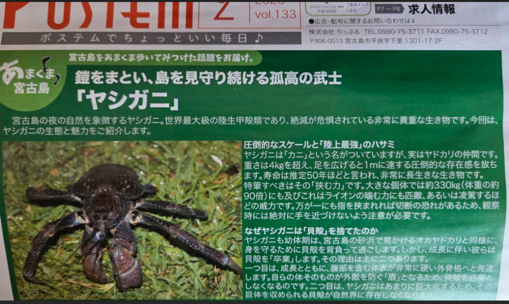 さらに、スーパーからの帰り。普段なら迷わず処分するはずのフリーペーパーの表紙に、釘付けになりました。そこには宮古島に生息する「ヤシガニ」が特集されていたのです。