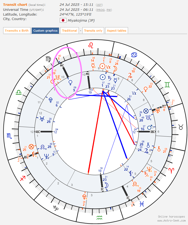 - 監査エビデンス: 乙女座9度台にある私の金星は、2025年7月に迎えた「太陽回帰図のMC(社会的到達点)」とも重なっています。そこに過去の清算を促すテイルが重なり、真向かいからヘッドと金星が光を当てている状態です。