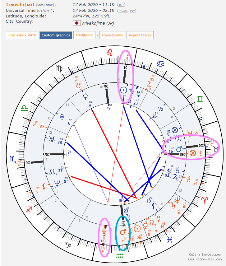 さらに日食図では、T水瓶座火星が私のネイタルIC(心の基盤)に重なっていました。これは、「自分の内側の聖域を、自らの情熱(火星)で守り、再構築せよ」という号令です。外部の期待に合わせるのではなく、自身の魂の拠点から火を噴くような創作エネルギーを湧き上がらせる。その準備が整ったことを示しています。