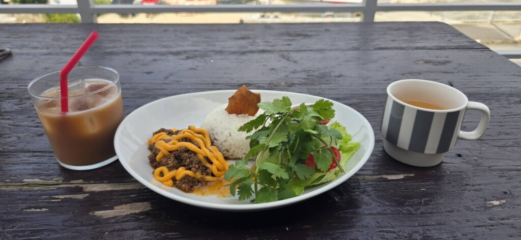 海を見渡せるお店で味わうランチ。タコライスに添えられた鮮やかなパクチーの香りが、思考で凝り固まっていた知性を、五感の世界へと引き戻してくれます。
