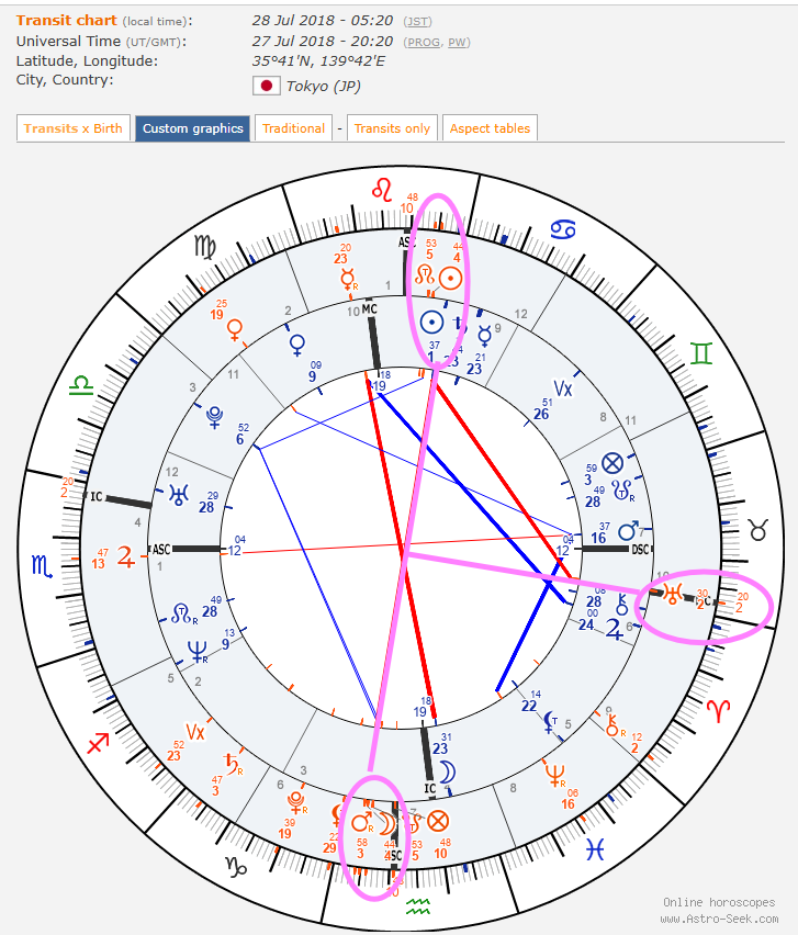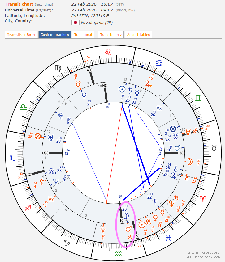 本日夕方、天空を走るトランジット(T)の火星が、私のネイタル(N)の水瓶座の月に正確に重なりました。この「合」の数時間前、痒みはピークに達しました。