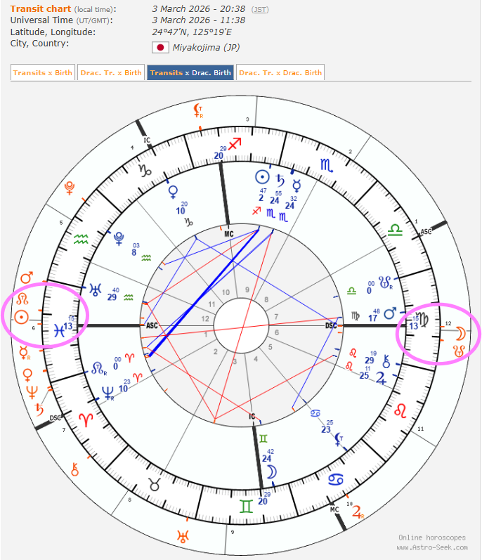 3月3日の乙女座月食の当日、天空を走る太陽は私の龍頭図(ドラコニックチャート)のASC(魚座)を通過しようとしていたのです。
