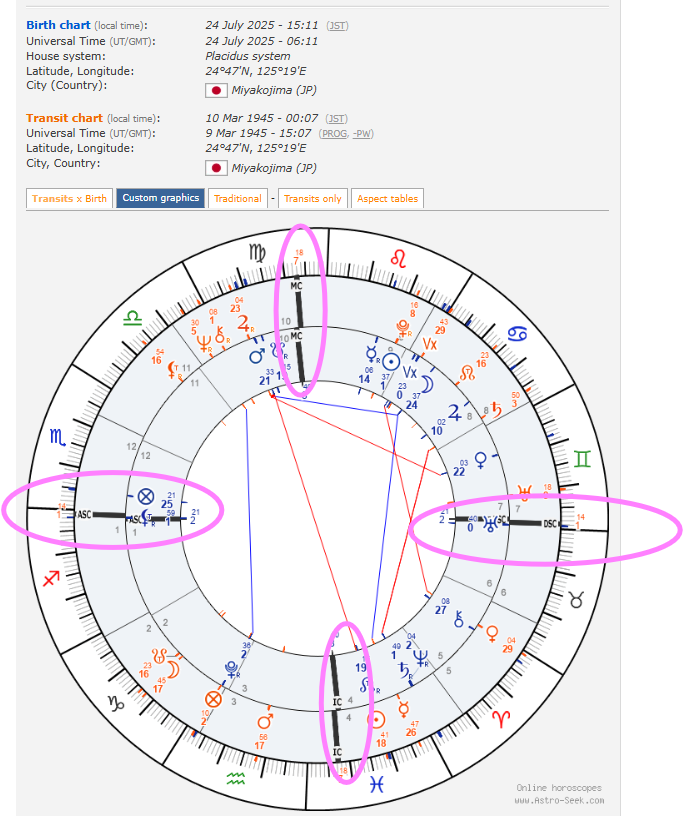 あの日のアングル(四隅の柱)が、私の2025年太陽回帰図と、わずか1度の違いで完全に一致していたのです。