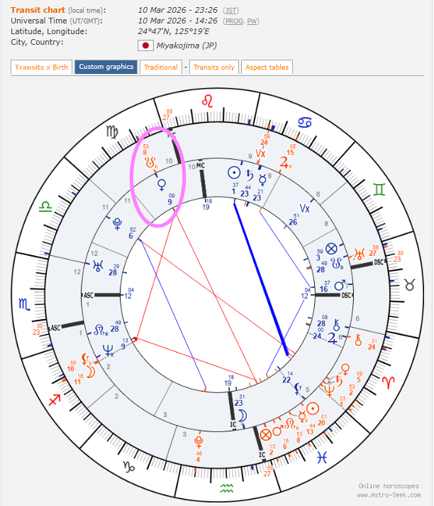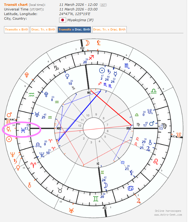 さらに驚くべきことに、その時のMC(天頂)には現在、過去の清算を司るドラゴンテイルが重なっています。これは、私の出生図における乙女座金星とも、わずか1度差の合。