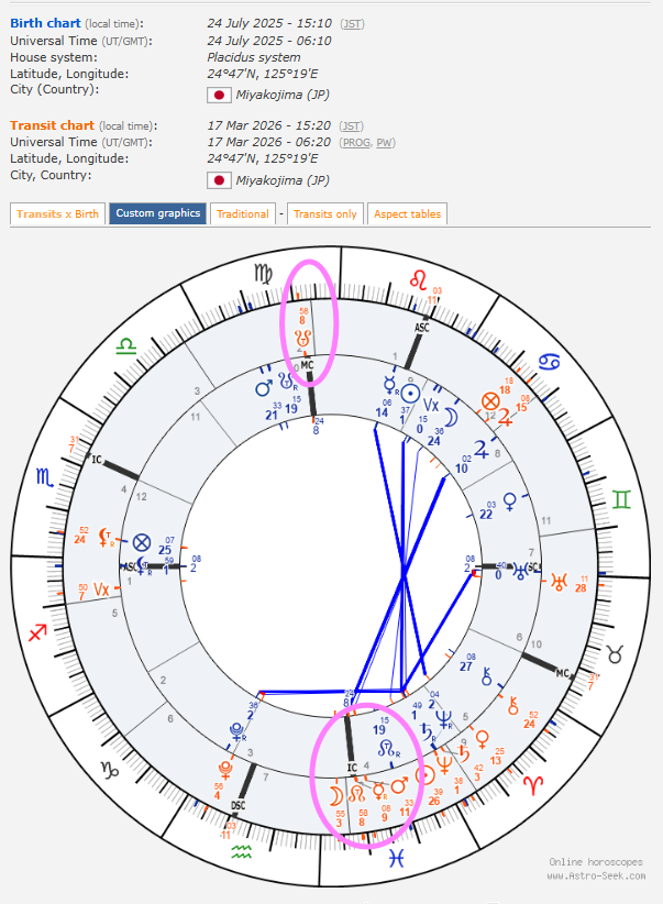 私の2025年太陽回帰図の魚座IC(心の基盤・住居)に対し、トランジットの魚座ドラゴンヘッドと逆行中の魚座水星が正確に重なっていたのです。